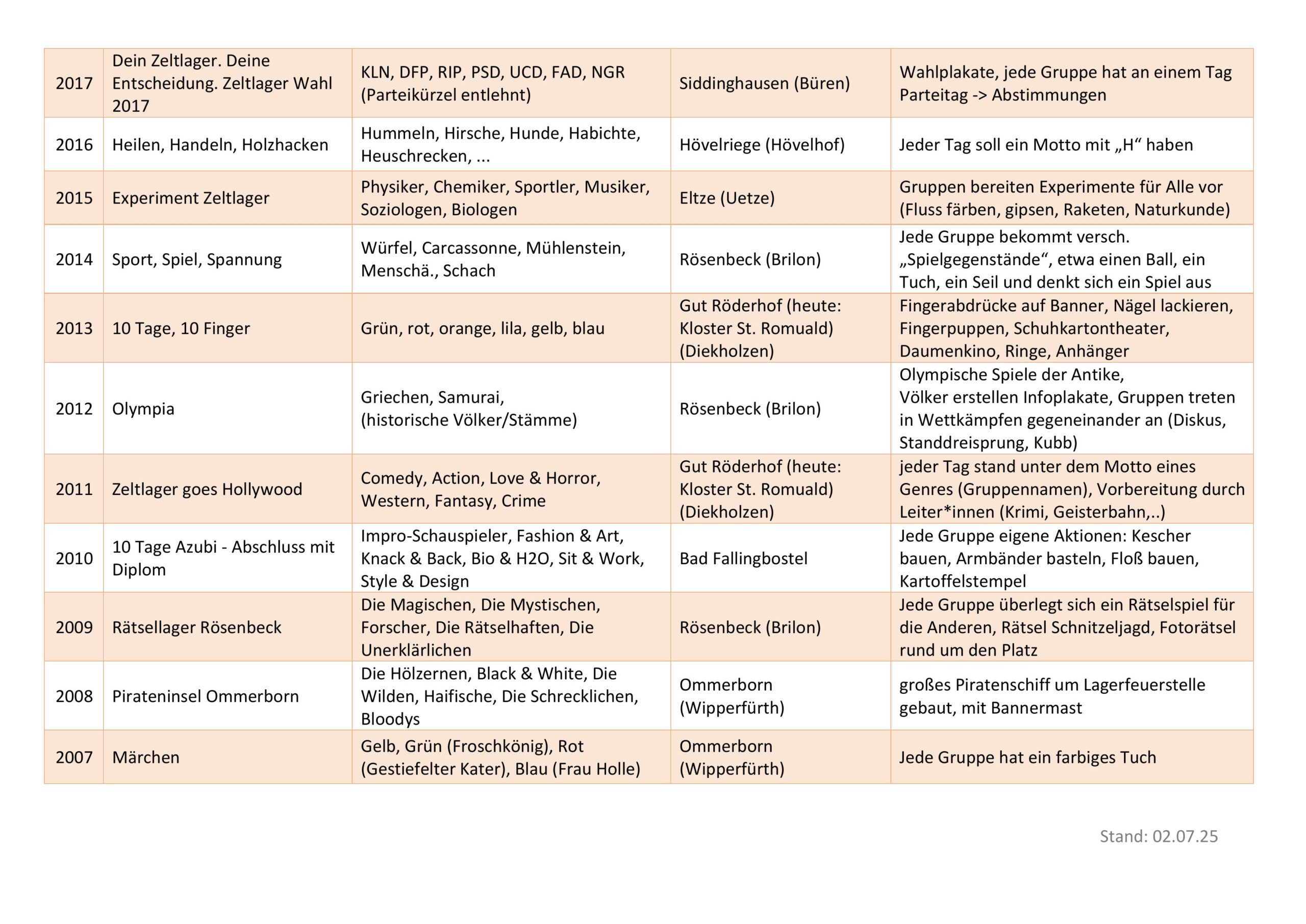 2017 | Dein Zeltlager. Deine Entscheidung. Zeltlager Wahl 2017 | KLN, DFP, RIP, PSD, UCD, FAD, NGR (Parteikürzel entlehnt) | Siddinghausen (Büren) | Wahlplakate, jede Gruppe hat an einem Tag Parteitag -> Abstimmungen |