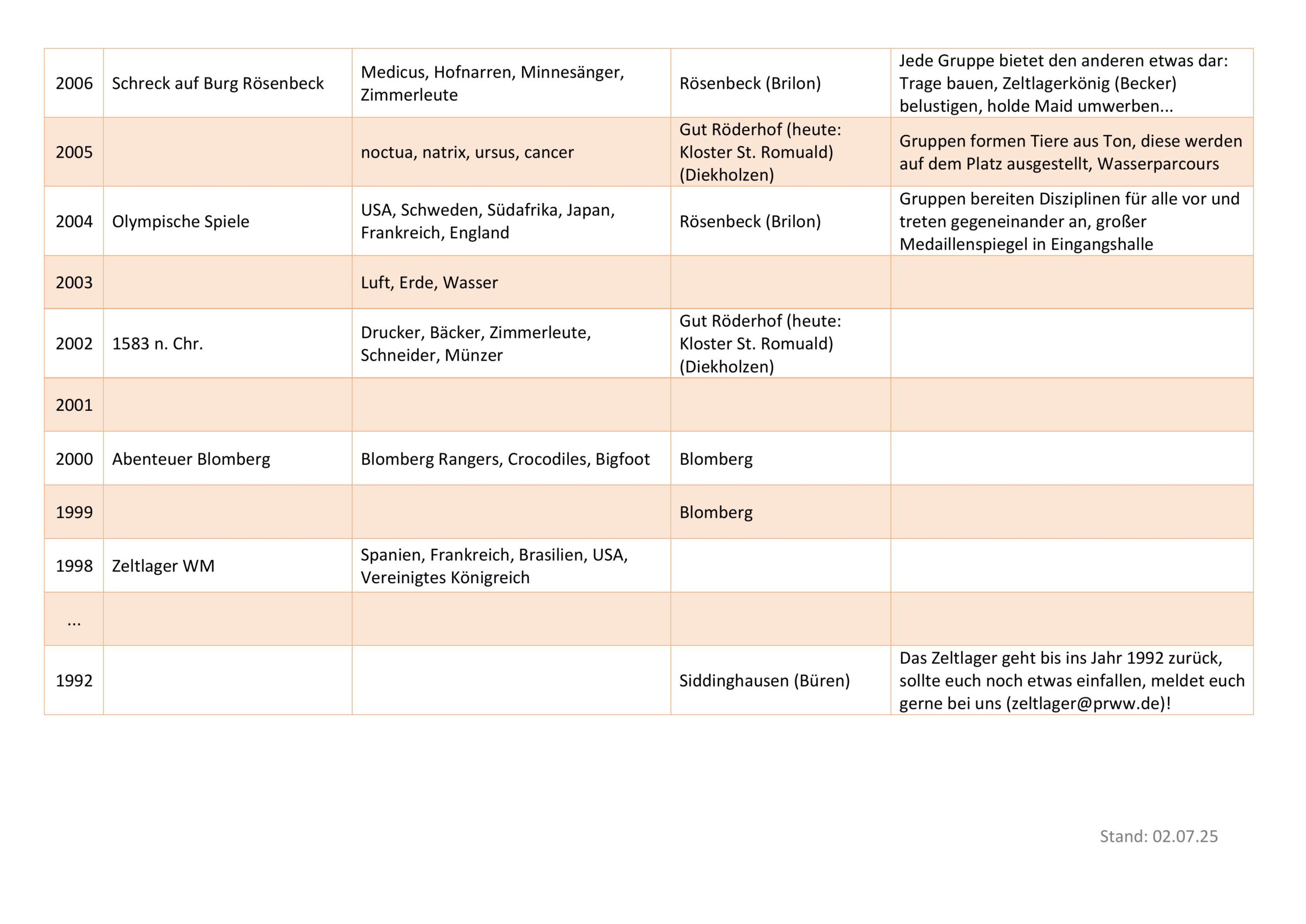 1992 | Siddinghausen (Büren) | Das Zeltlager geht bis ins Jahr 1992 zurück, sollte euch noch etwas einfallen, meldet euch gerne bei uns (zeltlager@prww.de)! |